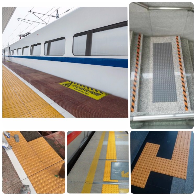 該產品由兩種組成:一種是圓點提示止步盲道磚;一種是條形行進指路盲道磚。一般高鐵用圓點盲道磚較多,地鐵用條形盲道磚較多。